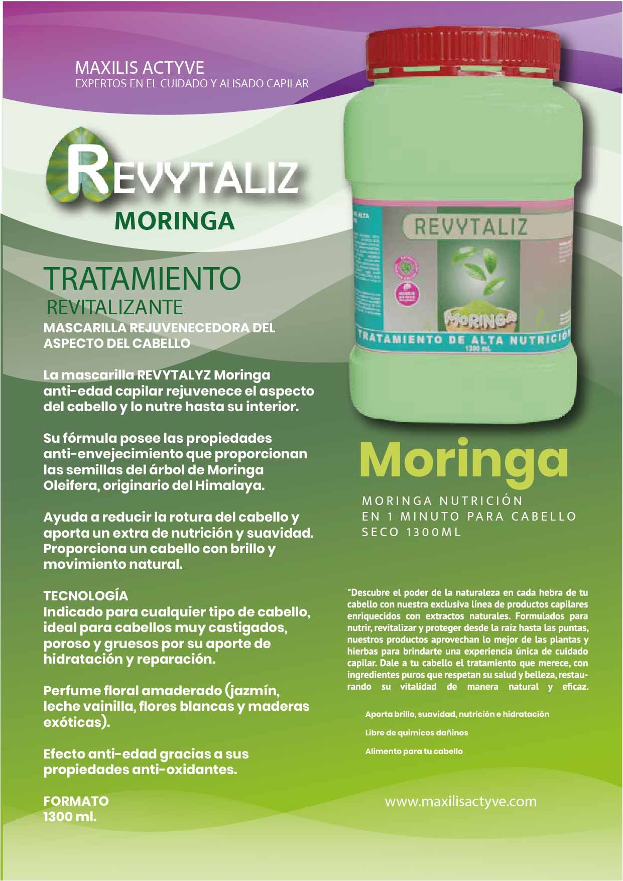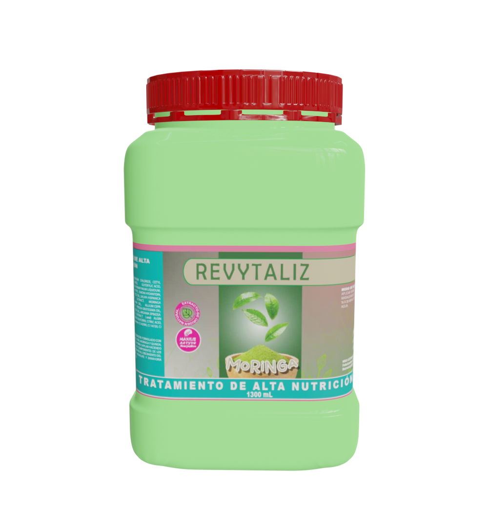 El Tratamiento de Moringa Revytaliz 1300 ml está formulado con extracto natural de moringa, una planta rica en vitaminas A, B, C y E, minerales y antioxidantes. Su poderosa acción nutre el cuero cabelludo, revitaliza cabellos secos y quebradizos, y aporta un brillo saludable desde la primera aplicación.